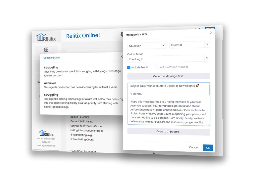 Know when your agents need support. Know when they’re thinking of making a move. Track their success in real time — and coach them at exactly the right moment. You’ll get alerts on their personal milestones — new listings, closed deals, and everything in between — and can follow-up with built-in email tools powered by AI to help you craft relevant messages that truly connect.